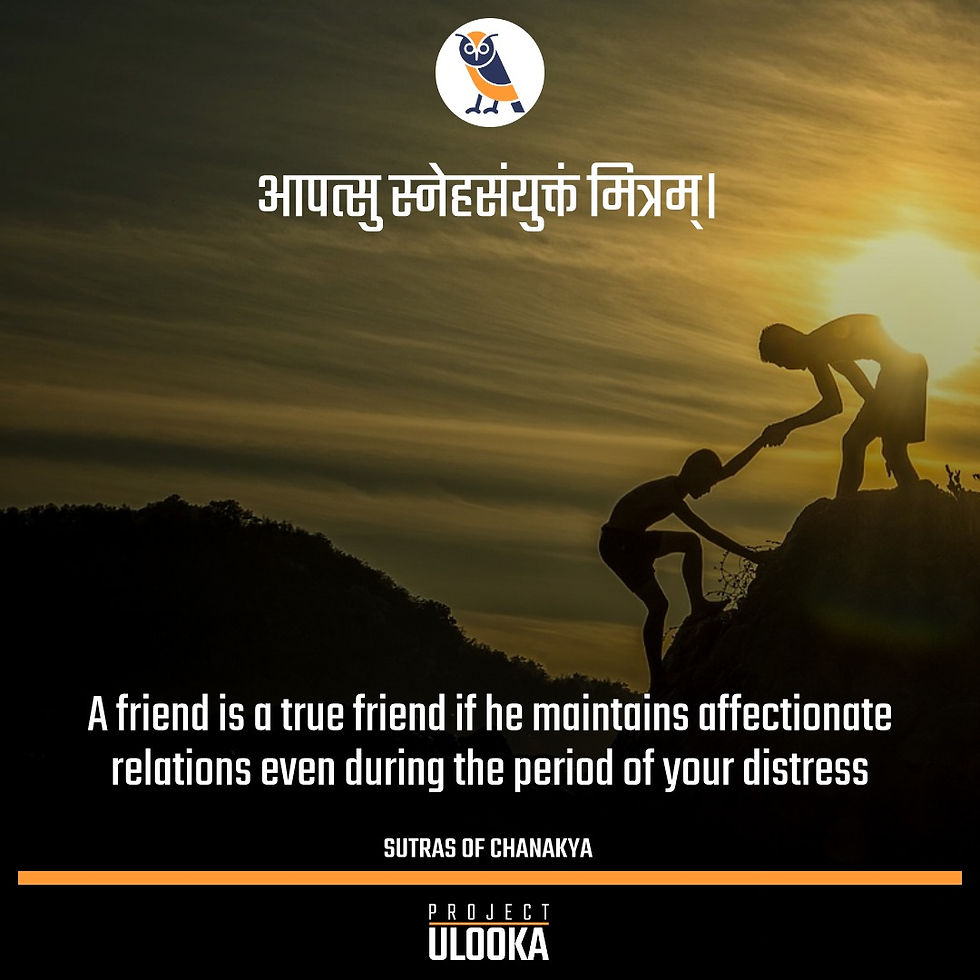 True Friends | Sutras of Chanakya - 35Apr 12, 20191 min readआपत्सु स्नेहसंयुक्तं मित्रम्।A friend is a true friend if he maintains affectionate relations even during the period of your distressA friend in need is friend indeed#Friend #Relationship #Life #Sutra